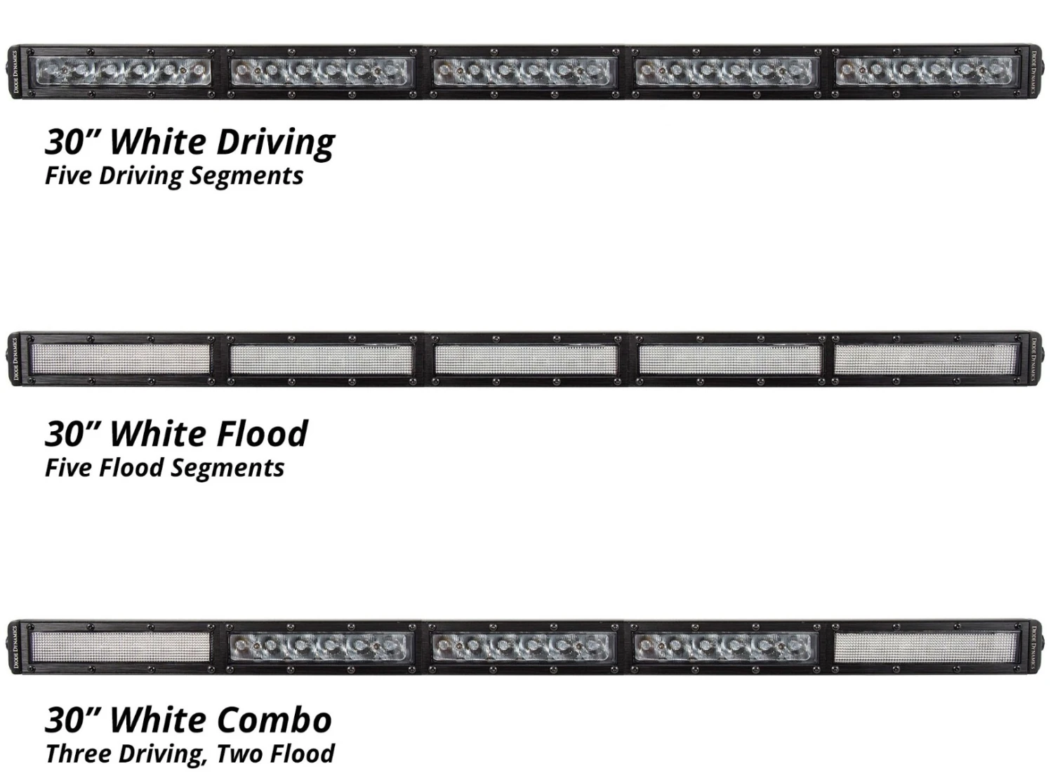 The Combo pattern combines both the Driving and Flood optics. It shines light downrange in a focused, rectangular 20Wx8H degree pattern while also illuminating area around it in a full 80Wx50H degree spread. The Stage Series 30″ Combo Light Bar features a single flood lens in the middle with two driving lenses on the outer edges.