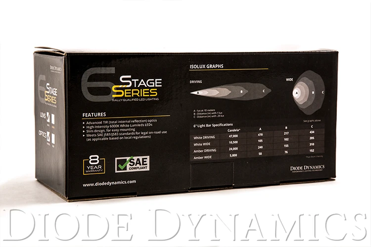 The Driving pattern was designed to supplement your high beams. Rather than a simple “spot” pattern, the Stage Series Driving pattern has a rectangular 20Wx8H degree pattern that is far more useful for directing light downrange at high speeds.