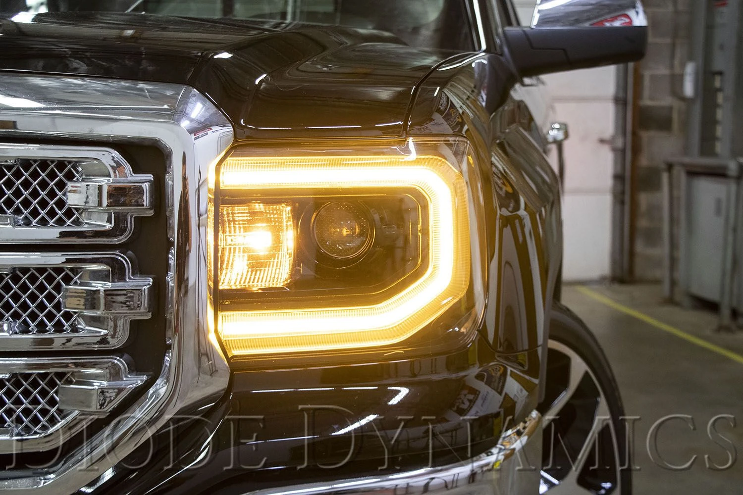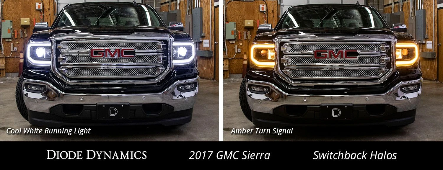 Time for an upgrade! From the factory, the Sierra comes with a white C-shaped DRL that from certain angles can look segmented and distorted. Diode Dynamics is excited to release our HD LED Halos for the 2016-2018 GMC Sierra that provides a much brighter, more uniform appearance compared to the factory optics. These computer-designed LED Halos are circuit boards that align perfectly behind the factory diffusing reflector. Available in switchback and amber-only, both versions also function as an additional front turn signal for a custom, yet functional look!